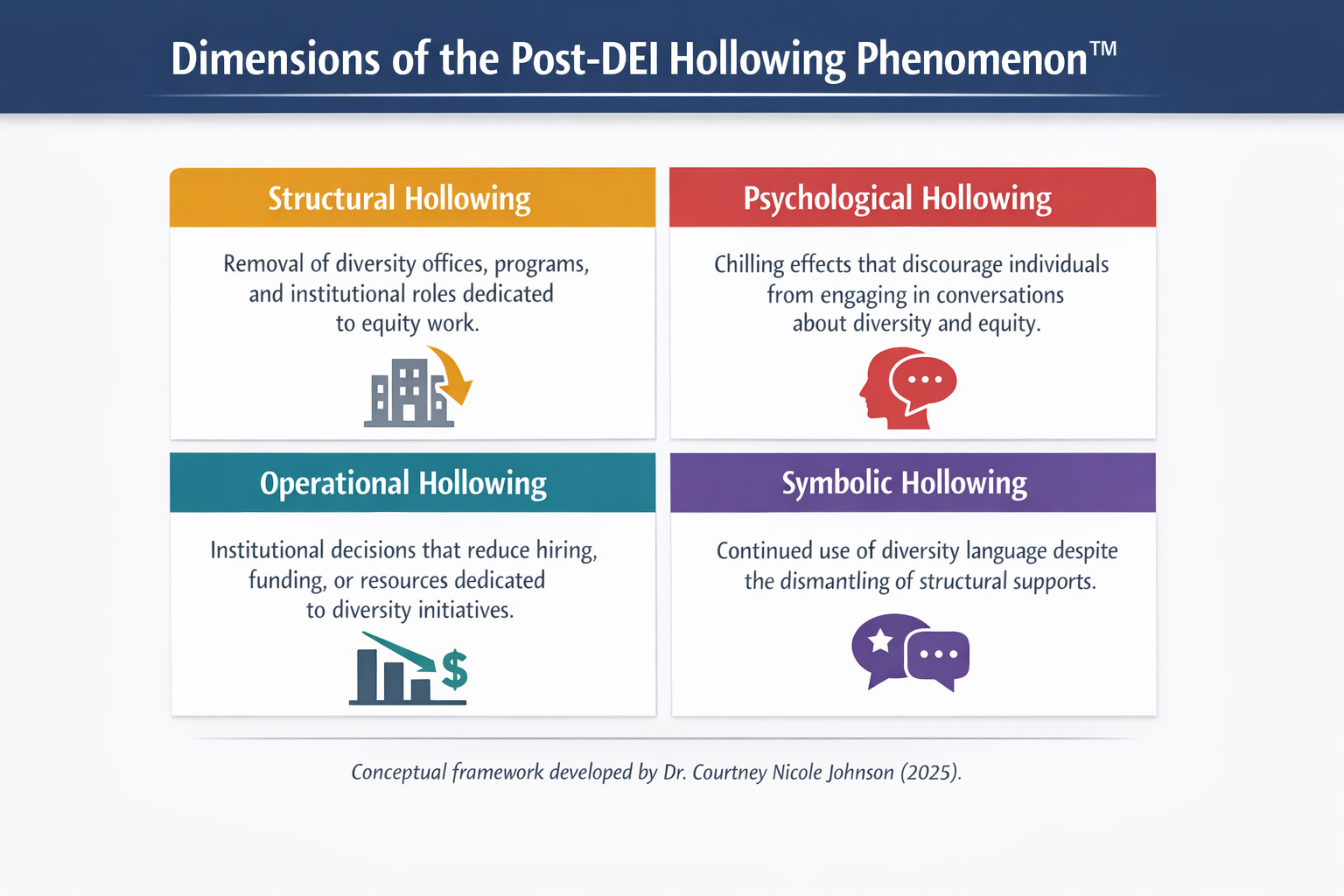 The Post-DEI Hollowing Phenomenon™ is an original conceptual framework developed by Dr. Courtney Nicole Johnson, Ed.D. (2025).